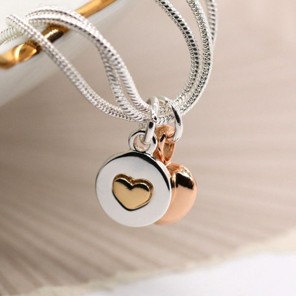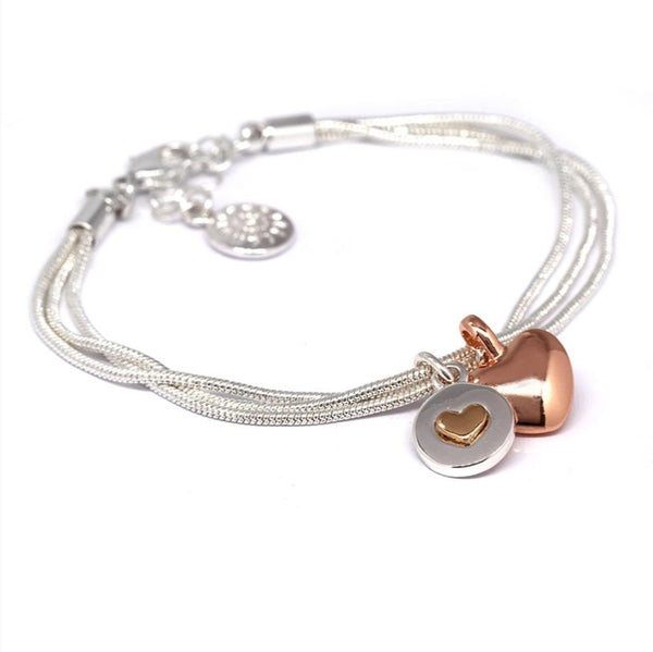 Silver plated triple snake chain bracelet with a double rose gold charm.
